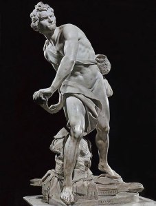Now I go to Rome, to early seventeenth century Rome and the genius of Gianlorenzo Bernini, and in particular, to one early, famous sculptural group of his, ‘Apollo and Daphne’. But first a mention of his ‘David’ as an introduction. There had been the earlier free standing statues by Donatello, Verrochio and Michaelangelo, all more than a hundred years old by the time Bernini begins work. It was quite an undertaking to set his own statue alongside these Florentine masterworks. It is recorded that Bernini modelled the face in his own likeness and had his assistants draw him in the pose he wanted. Previous statues had shown David either before or after the combat with Goliath: Bernini shows David in the act of beginning the movement of twisting in preparation for releasing the rock from the sling he holds stretched between his hands. Charles Avery in his study of Bernini gives an important insight into the thinking of the sculptor behind the composition and its placement in the Villa Borghese. Originally the spectator would have been led into gradually experiencing the nature of the body’s twisting and the intent of the movement. David’s right toes “urgently clutch the very edge of the base” suggesting “subliminally that the statue is stepping into the ‘real’ world”. The viewer comes on round the statue and as she experiences the tension in the plaited cords of the sling – “the sculptor’s technical prowess in cutting away durable marble… from all round those narrow extensions is breathtaking. It is a miracle they have never snapped” (Bernini, p 71). The viewer then arrives so as to be “seeing the distant Goliath in his mind’s eye almost from David’s point of view”. The movement in the statue is experienced through the movement of the viewer. This is something new in human experience.